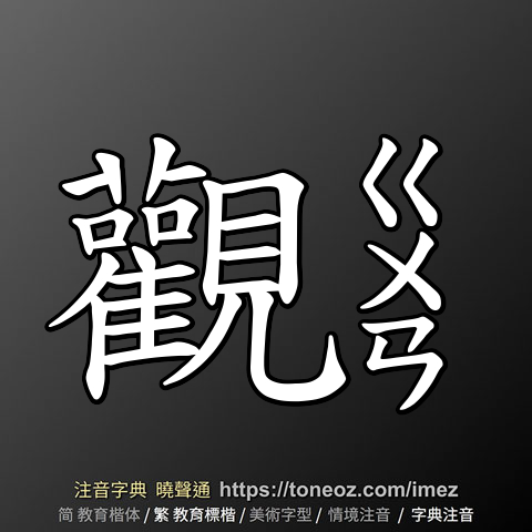 觀,注音ㄍㄨㄢˋ,拼音guàn,辭典解釋為:1.道教的廟宇。例:道觀 2.六十四卦之一。坤(☷)下巽(☴)上。象先王教化風行於世之意。