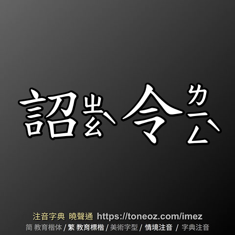 詔令,注音ㄓㄠˋ ㄌㄧㄥˋ,拼音zhào lìng,辭典解釋為:1.皇帝的命令。《韓非子.初見秦》:「土地廣而兵強,戰剋攻取,詔令天下。」《初刻拍案驚奇》卷二八:「又詔令太醫院有名醫人數個,到寓診視。」也作「詔敕」。 2.文體名。是古代帝王、皇太后或皇后所發命令、文告的通稱。包括冊文、制、敕、詔、誥等。