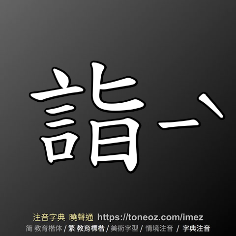 詣,注音ㄧˋ,拼音yì,辭典解釋為:1.到、前往。例:詣京趕考、詣闕上書 2.程度、境界。例:造詣 3.進見、造訪。例:詣太守