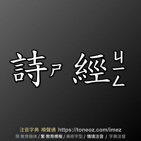 詩經,注音ㄕ ㄐㄧㄥ,拼音shī jīng,辭典解釋為:書名。中國最早的詩歌總集。非一時一地一人所作,採集從周初至春秋中葉五百年間的歌謠作品和宗廟樂章,共三百零五篇,分為風、雅、頌三大類,為中國文學總集之祖,代表當時北方文學。漢初傳者有齊、魯、韓、毛四家,漢末以後,齊、魯、韓三家詩逐漸衰微,惟毛詩,盛行至今。