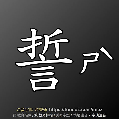 誓,注音ㄕˋ,拼音shì,辭典解釋為:1.以言語表明決心或約定。例:宣誓、誓不兩立、誓不甘休 2.表明決心或約定的言詞。例:信誓旦旦、山盟海誓 3.告誡。例:誓師