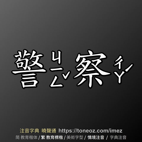 警察,注音ㄐㄧㄥˇ ㄔㄚˊ,拼音jǐng chá,辭典解釋為:依法以維持公共秩序、保護社會安寧、促進人民福利為主要任務的人。例:警察打擊犯罪,保護民眾安全,可說是人民的保母。