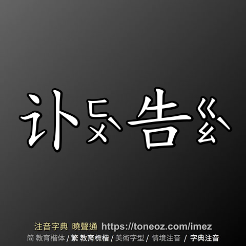 辭典解釋為:告,1.訴說、向人說明。例:告訴、報告、告退 2.請求。例:告饒、告假、告貸 3.揭發、提出訴訟。例:告狀、控告 4.對大眾宣布的語言或文字。例:公告、廣告、文告 5.規勸。例:忠告 6.訴訟的兩方。例:原告、被告...