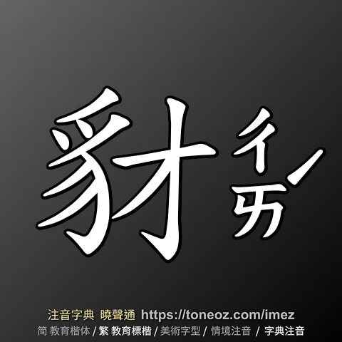豺,注音ㄔㄞˊ,拼音chái,辭典解釋為:動物名。哺乳綱食肉目裂腳亞目犬科。外形似狼,前後肢各有四趾,比其他犬科動物少一趾。聽、嗅、視覺都非常敏銳,犬齒像刀片一樣銳利。善跳躍,性凶殘,常群體合作圍捕鹿、水牛等大型獵物。