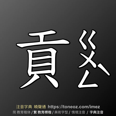 貢,注音ㄍㄨㄥˋ,拼音gòng,辭典解釋為:1.古代向帝王進獻貢物。例:萬邦來貢 2.進獻的物品。例:進貢、納貢 3.古代向朝廷荐舉、推舉人才。例:貢生、貢舉 4.姓。