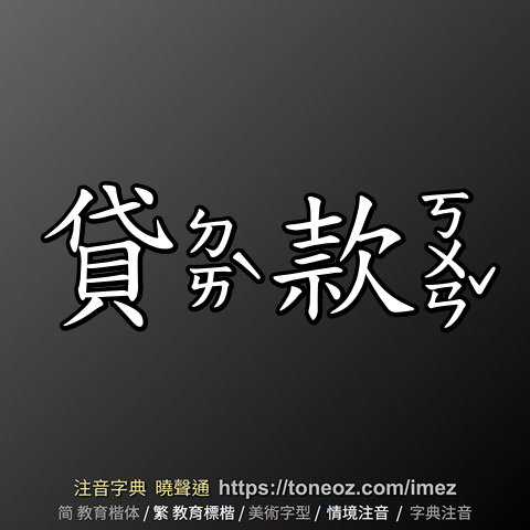 貸款,注音ㄉㄞˋ ㄎㄨㄢˇ,拼音dài kuǎn,辭典解釋為:1.指金融機構放款或向金融機構借款。一般要規定利率和償還日期。例:為了購屋,他向銀行貸款。 2.借貸的款項。例:我的貸款數目較大,得要五年才能償清。