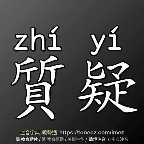 質疑,注音ㄓˊ ㄧˊ,拼音zhí yí,辭典解釋為:心中懷疑而向人提出問題。例:協調會上,民眾對於政府官員的解說,紛紛提出質疑。