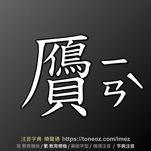 贗,注音ㄧㄢˋ,拼音yàn,辭典解釋為:假的、偽造的。例:贗品、贗本