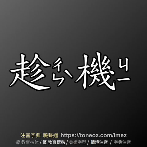 趁機,注音ㄔㄣˋ ㄐㄧ,拼音chèn jī,辭典解釋為:利用機會。例:老師向同學們敘述事故的經過,並趁機對大家提示為人處世的道理。