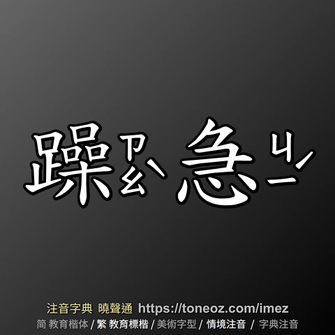 躁急,注音ㄗㄠˋ ㄐㄧˊ,拼音zào jí,辭典解釋為:性情急躁。《宋史.卷二九一.李若谷傳》:「輕率躁急,無威重,喜以語侵人,獨為王安石知,故既廢即起。」
