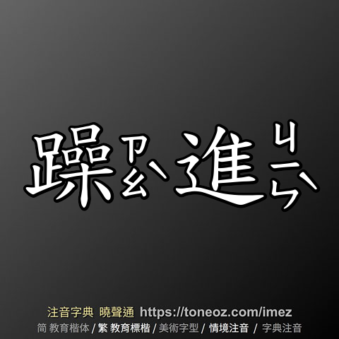 躁進,注音ㄗㄠˋ ㄐㄧㄣˋ,拼音zào jìn,辭典解釋為:急於求進。例:俗話說:「欲速則不達。」他如此躁進,只會壞了大事。