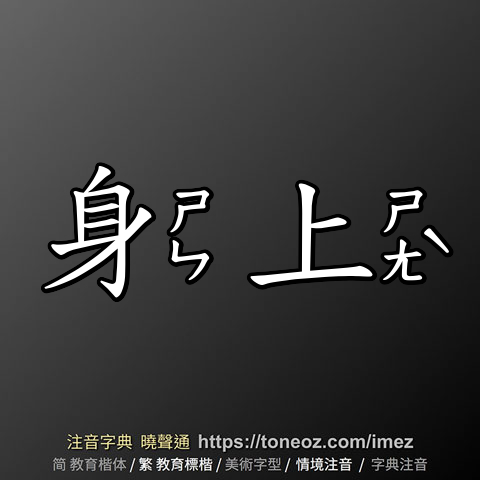 身上,注音ㄕㄣ ㄕㄤˋ,拼音shēn shàng,辭典解釋為:1.身體。《紅樓夢》第五七回:「姑娘身上又病著,更費了大事,誤了你老出門。」《文明小史》第一六回:「身上一件打補釘的竹布長衫,腳上穿著黑襪,趿了一雙破鞋。」 2.身邊。《水滸傳》第一○回:「林冲大怒,離了李小二家,先去街上買把解腕尖刀,帶在身上。前街後巷,一地里去尋。」《紅樓夢》第七四回:「這東西也不是常帶著的,我縱有,也只好在家裡,焉肯帶在身上各處去。」 3.自身、本身。《儒林外史》第一回:「你尊堂家下大小事故,一切都在我老漢身上,替你扶持便了。」《紅樓夢》第七一回:「我們的性命都在姐姐身上,只求姐姐超生要緊。」