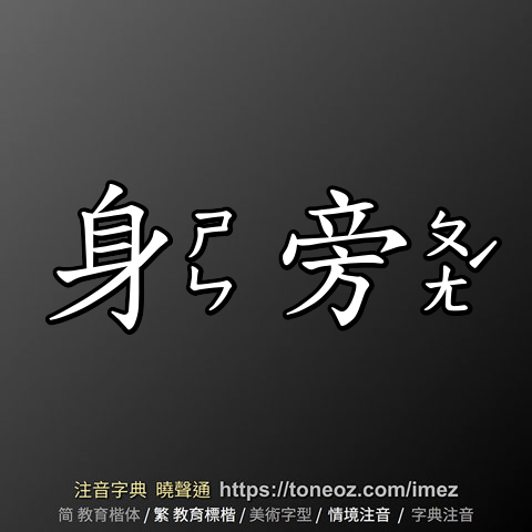 辭典解釋為:身,1.軀體的總稱,或專指軀幹。例:轉身、翻身、人面蛇身 2.物體的中心或主要部分。例:車身、船身、機身 3.親自、自己。例:以身作則、身先士卒、身臨其境 4.資格、地位。例:身敗名裂 5.量詞。計算佛像數量的單位。例:夾道兩旁有菩薩五百身。...