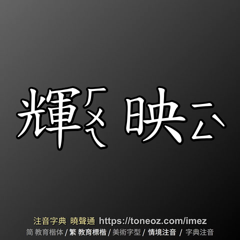 輝映,注音ㄏㄨㄟ ㄧㄥˋ,拼音huī yìng,辭典解釋為:相互映照。例:日月潭的山光水色相互輝映,風景十分秀麗。