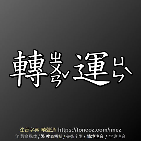 轉運,注音ㄓㄨㄢˇ ㄩㄣˋ,拼音zhuǎn yùn,辭典解釋為:1.轉送運輸。例:這批貨物將轉運到北部去。 2.運氣好轉。例:他前一陣子諸事不順,現在已經開始轉運了。