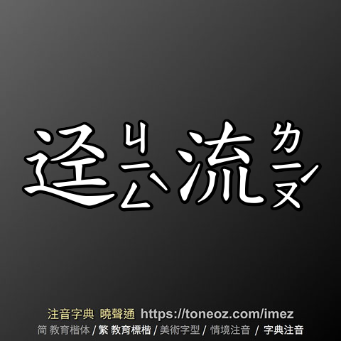 辭典解釋為:流,1.水的通稱。例:水流、隨波逐流 2.像水流的東西。例:電流、氣流、車流 3.移動。例:人口外流 4.放逐。例:流放 5.趨向。例:流於形式 6.品類、等級。例:名流、上流、一流、九流十家 7.留傳、散布。例:流芳萬世 8.往來不定的、運轉不停的。例:流民、流星、流年 9.意外的、沒有根據的。例:流彈、流矢、流言 10. 古代一種將犯人放逐遠方的刑法。例:流放...