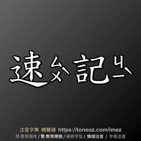 速記,注音ㄙㄨˋ ㄐㄧˋ,拼音sù jì,辭典解釋為:用簡略的符號,迅速記錄別人說話內容的方法,多用於演講或會議時。例:速記的原理主要為記音,以速記記錄內容後,再經翻譯即可恢復原義。