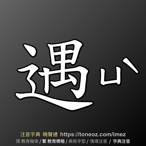 遇,注音ㄩˋ,拼音yù,辭典解釋為:1.相逢。例:奇遇、巧遇、遇人不淑 2.機會。例:機遇、際遇、良遇 3.對待。例:禮遇、待遇、殊遇 4.遭受。例:遇難、遇害