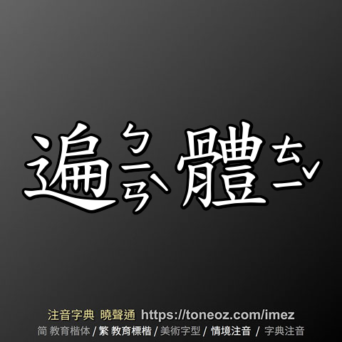 遍體,注音ㄅㄧㄢˋ ㄊㄧˇ,拼音biàn tǐ,辭典解釋為:全身。如:「他不小心滑落山谷,雖然傷痕遍體,所幸並無大礙。」元.關漢卿《救風塵》第二折:「著那廝通身酥,遍體麻,將他鼻凹兒抹上一塊砂糖。」《紅樓夢》第四七回:「待要扎掙起來,無奈遍體疼痛難禁。」