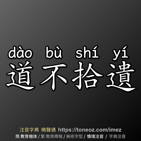 道不拾遺,注音ㄉㄠˋ ㄅㄨˋ ㄕˊ ㄧˊ,拼音dào bù shí yí,辭典解釋為:即「路不拾遺」。見「路不拾遺」條。01.《戰國策.秦策一》:「期年之後,道不拾遺,民不妄取,兵革大強,諸侯畏懼。」(源)02.唐.司空圖〈解縣新城碑〉:「人皆知恥,道不拾遺;視禮法之率由,信恩威之並濟。」