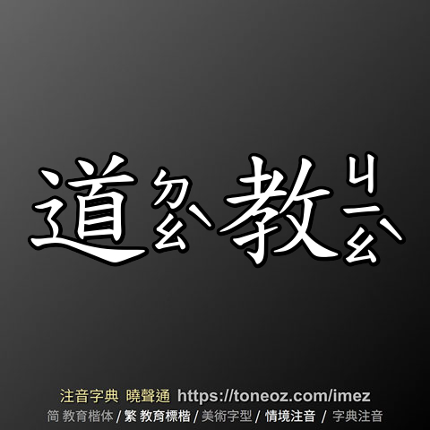 道教,注音ㄉㄠˋ ㄐㄧㄠˋ,拼音dào jiào,辭典解釋為:崇奉元始天尊及太上老君為教祖的宗教。相傳創於東漢張陵,陵著有《道書》二十篇,自號天師,故亦稱為「天師道」。以符咒為人治病,講煉丹長生之術,入教者須繳納五斗米,時人稱為「五斗米道」。始盛行於蜀郡,後經弟子廣布,信徒漸增,遂正式成為道教,流傳全國。例:長久以來,道教與儒家、佛教思想結合,融入日常生活當中,一般人難以分辨。 △玄門、玄教