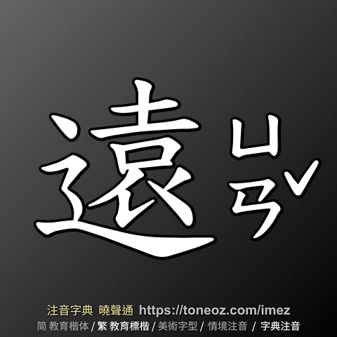 遠,注音ㄩㄢˇ,拼音yuǎn,辭典解釋為:1.時間、空間的距離大。與「近」相對。例:久遠、遠途、遙遠  2.深奧。例:深遠、言近旨遠 3.血緣關係不近的。例:遠親、遠房兄弟