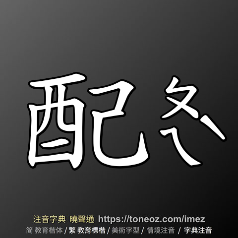 配,注音ㄆㄟˋ,拼音pèi,辭典解釋為:1.婚嫁。例:許配、婚配 2.配偶。例:元配、擇配 3.動物交合。例:配種、交配 4.依適當的標準或比例,加以調和或拼製。例:配藥、配色、配眼鏡 5.分發、安排。例:支配、分配、配給 6.流放罪人到遠方。例:發配、刺配 7.陪襯、襯托的。例:配角、配飾 8.適合、夠資格。例:他年紀輕輕,在藝術上就有傑出的表現,的確配稱為天才。