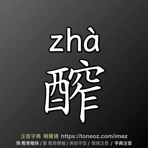 醡,注音ㄓㄚˋ,拼音zhà,辭典解釋為:[名] 壓酒的器具。宋.楊萬里〈新酒歌〉:「松槽葛囊纔上醡,老夫脫帽先嘗新。」 [動] 壓酒、製酒。宋.楊萬里〈夜飲〉詩:「酒新今晚醡,燭短昨宵餘。」《水滸傳》第六五回:「卻是一個村酒店,半夜裡起來醡酒。」