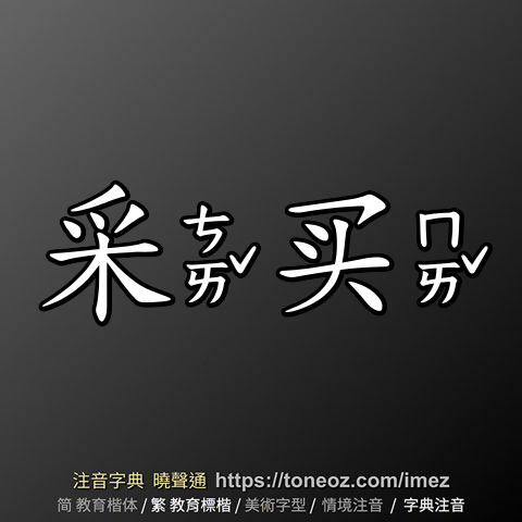 辭典解釋為:采,1.神色。例:神采、丰采、興高采烈 2.顏色。同「彩」。例:多采多姿 3.讚美、誇獎的歡呼聲。例:喝采 4.摘取。同「採」。...