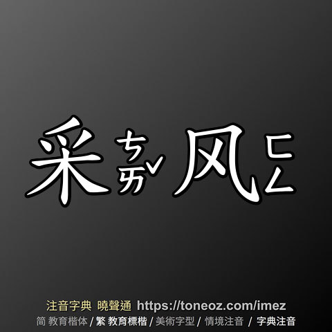 辭典解釋為:采,1.神色。例:神采、丰采、興高采烈 2.顏色。同「彩」。例:多采多姿 3.讚美、誇獎的歡呼聲。例:喝采 4.摘取。同「採」。...