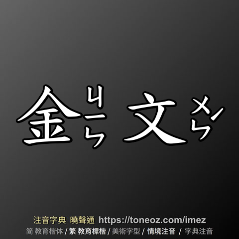 金文,注音ㄐㄧㄣ ㄨㄣˊ,拼音jīn wén,辭典解釋為:商周秦漢時代鑄刻在青銅器上的文字。銅為金屬,所以稱做「金文」。例:金文記載了許多當時政治、社會等多方面的活動情形,是研究古代歷史、文化等的第一手資料。