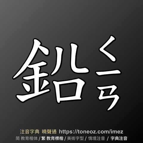鉛,注音ㄑㄧㄢ,拼音qiān,辭典解釋為:化學元素。符號為Pb。色青,質軟有延展性,置於空氣中則氧化迅速。為電的不良導體,抗腐蝕性強。可與其他金屬化合而製成蓄電池、電纜外皮、防輻射線的材料等,用途甚廣。例:鉛管、鉛中毒