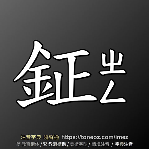 鉦,注音ㄓㄥ,拼音zhēng,辭典解釋為:樂器名。打擊樂器。銅製,形似鐘而狹長,有長柄可持執。是古代行軍樂器,用來調整或停止步伐。例:鉦鼓
