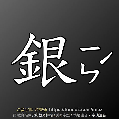 銀,注音ㄧㄣˊ,拼音yín,辭典解釋為:1.化學元素。符號為Ag。金屬元素之一。白色,光澤甚美,質軟,富延展性,易傳熱及導電。產量稀少,自古即被視為貴重金屬。可供合金、製造貨幣、餐具及裝飾品之用。例:白銀 2.金錢、貨幣。例:銀兩、銀貨兩訖 3.白亮的、色白如銀的。例:銀髮、銀幕 4.銀製的、含銀質的。例:銀箸、銀器 5.與貨幣有關的。例:銀行、銀根 6.姓。
