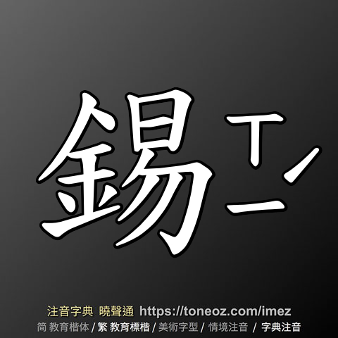 錫,注音ㄒㄧˊ,拼音xí,辭典解釋為:1.化學元素。符號為Sn。銀白色,富延展性,在空氣中不易起變化。能溶於酸及熱氫氧化鉀溶液,但不溶於水。質地較鉛堅韌。常用來焊接、鍍鐵與製造合金。 2.賜與、賜給。通「賜」。