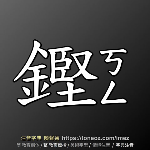 鏗,注音ㄎㄥ,拼音kēng,辭典解釋為:狀聲詞。形容彈擊金屬瓦石或琴瑟的聲音。例:這組仿古編鐘,敲起來鏗然合韻,十分好聽。