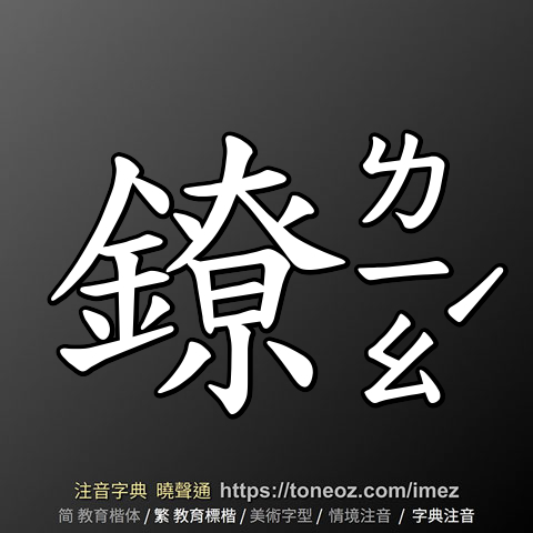 鐐,注音ㄌㄧㄠˊ,拼音liáo,辭典解釋為:鎖住犯人兩腳的刑具。例:腳鐐手銬