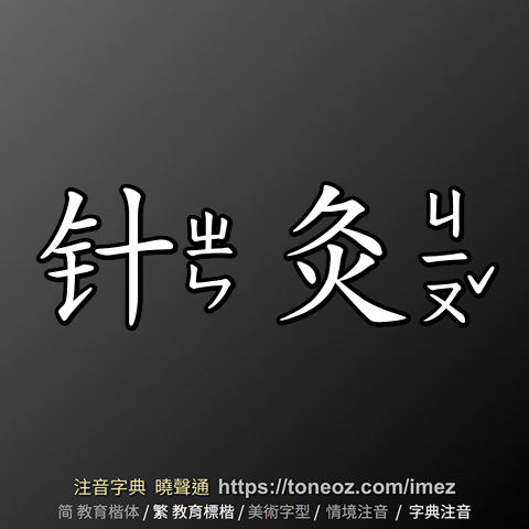 辭典解釋為:灸,中醫的一種治療方法。用點燃的艾炷或艾絨,熏熱人體的穴位,以達治療的目的。例:針灸、回旋灸、溫和灸...