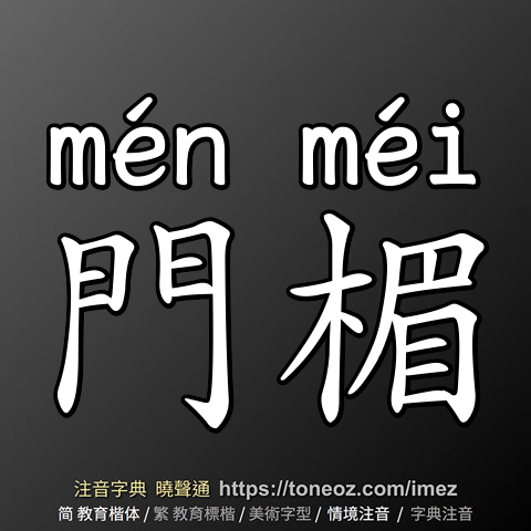 門楣,注音ㄇㄣˊ ㄇㄟˊ,拼音mén méi,辭典解釋為:1.門戶上邊的橫梁。例:這座宅院的門楣上掛著一塊「子孝孫賢」的匾額。 2.借指家族、門第。例:光耀門楣