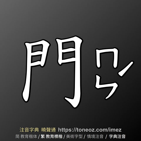 門,注音ㄇㄣˊ,拼音mén,辭典解釋為:1.建築物或車、船等可以開關的出入口,也指設於出入口能關閉的裝置。例:房門、車門、鐵捲門 2.形狀或作用像門的物體。例:閘門、水門、肛門 3.家族、門第。例:寒門、豪門 4.學派、宗派。例:佛門、獨門絕活 5.關鍵、要點、方法。例:竅門、不二法門 6.類別。例:分門別類、五花八門 7.生物學上分類系統所用的等級之一。例:脊椎動物門 8.量詞:(1) 計算學科、技藝門類的單位。例:一門功課、兩門技術 (2) 計算大炮的單位。例:三門大炮 (3) 計算親戚家數的單位。例:他有兩門親戚。 9.姓。