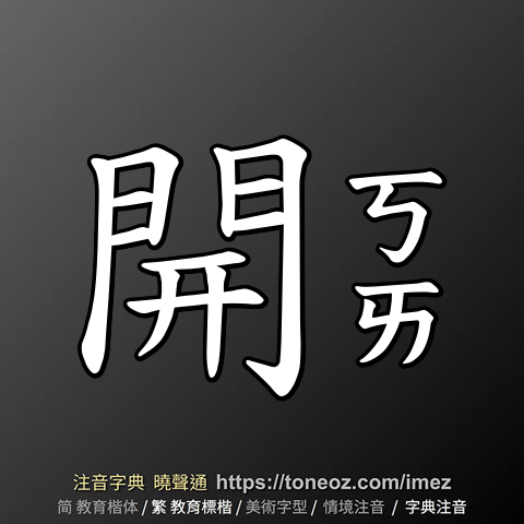 開,注音ㄎㄞ,拼音kāi,辭典解釋為:1.張啟。與「閉」、「關」相對。例:開門、開口、開箱 2.舒張、綻放。例:開顏、開懷、盛開 3.發動、啟動。例:開車、開船、開飛機 4.發掘、拓展。例:開礦、開荒、開疆闢土 5.創辦、設立。例:開店、開國 6.起始做某種行為、動作。例:開學、開工、開飯 7.條列、列出。例:開藥方、開書目、開發票 8.沸騰。例:水開了 9.副詞:(1) 放在動詞後,表示通透、豁達的意思。例:看開、想開 (2) 放在動詞後,表示擴張、擴展的意思。例:傳開、散開 10. 量詞。計算紙張大小尺寸的單位。切割一大張紙為若干分之一稱為「開」。例:對開、四開、十六開