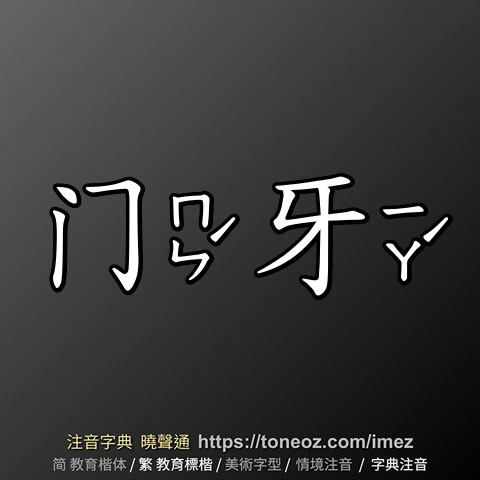 辭典解釋為:牙,1.人和動物口腔內咀嚼研磨的器官。有時專指臼齒部分。例:門牙、張牙舞爪、咬牙切齒 △牙齒 2.買賣時居中的介紹人。例:牙人、牙婆、牙行...