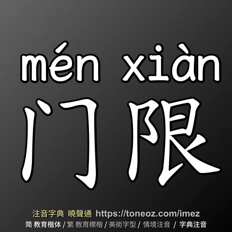 辭典解釋為:限,1.門下橫木。例:門限、戶限 2.一定的範圍。例:期限、界限、下限 3.制定在一定範圍內不許超越。例:限期完工、限量採購...