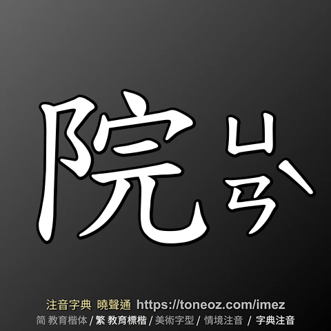 院,注音ㄩㄢˋ,拼音yuàn,辭典解釋為:1.圍牆內房屋四周的空地。例:庭院、後院 2.某些機關、場所的名稱。例:醫院、戲院、立法院 3.學院的簡稱。例:大學院校