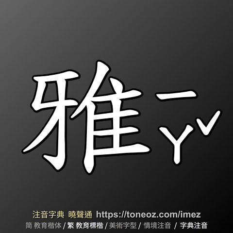 雅,注音ㄧㄚˇ,拼音yǎ,辭典解釋為:1.《詩經》體裁之一。於天子諸侯朝會宴饗時歌誦。有大雅、小雅之分。例:風、雅、頌是《詩經》的三種體裁。 2.合乎標準、規範的。例:雅言 3.高尚的、不俗的。例:優雅、典雅、雅室