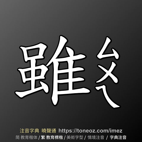 雖,注音ㄙㄨㄟ,拼音suī,辭典解釋為:縱使、即使。例:雖然、雖死猶生