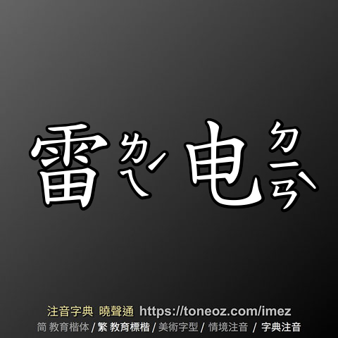 辭典解釋為:雷,1.大氣放電時,激盪空氣所發出的巨響。例:打雷、雷雨、春雷 2.爆炸性的武器。例:地雷、水雷、魚雷 3.形容聲音很大。例:瓦釜雷鳴 4.姓。...