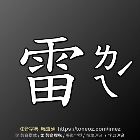 雷,注音ㄌㄟˊ,拼音léi,辭典解釋為:1.大氣放電時,激盪空氣所發出的巨響。例:打雷、雷雨、春雷 2.爆炸性的武器。例:地雷、水雷、魚雷 3.形容聲音很大。例:瓦釜雷鳴 4.姓。