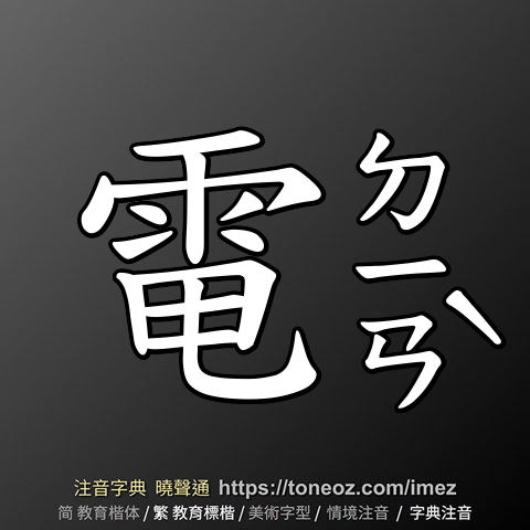 電,注音ㄉㄧㄢˋ,拼音diàn,辭典解釋為:1.一種物質固有的能量,為自然界基本現象之一。當正電負電接觸或失去均衡時,發生放電作用,產生光和熱。例:閃電、靜電、停電 2.藉電力發動或使用的。例:電梯、電燈、電視 3.電報、電話或電訊的簡稱。例:回電、賀電、外電報導 4.男女相互的吸引力所產生的微妙情愫。例:兩人一見鍾情,初次見面就來電了。