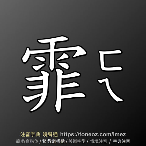 霏,注音ㄈㄟ,拼音fēi,辭典解釋為:1.雨雪綿密的樣子。例:細雨霏霏、雨雪其霏 2.雲氣。例:日出霏開 3.飄揚。例:煙霏露結